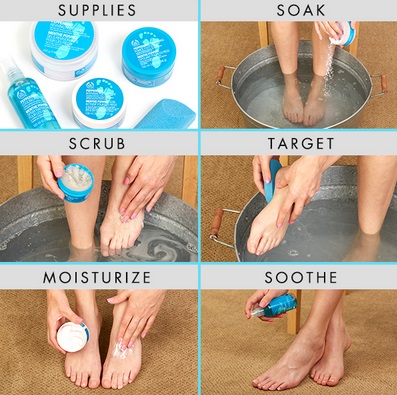 Шаг №1: начни с расслабляющего отмачивания. В большую емкость с водой ты можешь добавить масло мяты и шипучей соли, которая поможет очистить кожу от мертвых частичек кожи. Подержи ступни в воде 5-10 минут, а заодно расслабься и сама!