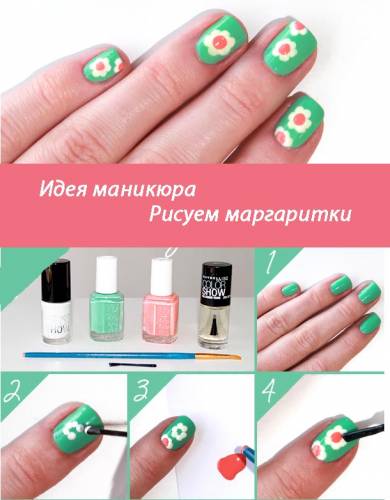 Для каждого отдельного события существует отдельный дизайн ногтей. Более того, для каждого определенного случая существует свой цветочный дизайн маникюра! Собираешься на первое свидание? Эти романтические бутоны роз определенно нарисованы с намеком! Что же касается тренда в маникюре на сегодняшний день, таковым являются беспечные маргаритки с белыми лепестками. С таким маникюром ты можешь и попить кофе в кафе с подругами, и прогуляться на природе с друзьями. Итак, быстрей собирай все необходимые сред...