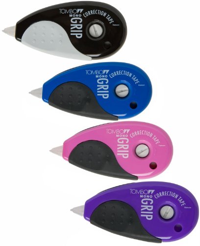 Tombow MONO Grip Correction Tape, .2 x 394 Inches, Top Action, White Tape, Single Line, Black, Blue, Pink, Purple Dispensers, 4 Pack (68762)