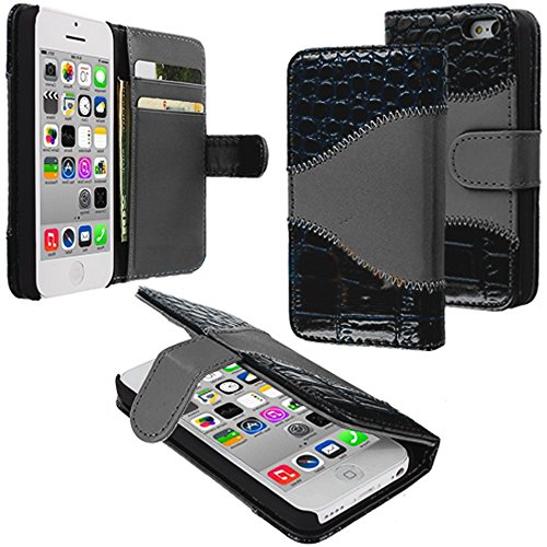 myLife Charcoal Black+Gray and Navy Blue {Crocodile Design} Faux Leather (Card, Cash and ID Holder + Magnetic Closing + Hand Strap) Slim Wallet for the iPhone 5C Smartphone by Apple (External Textured Synthetic Leather with Magnetic Clip + Internal Secure