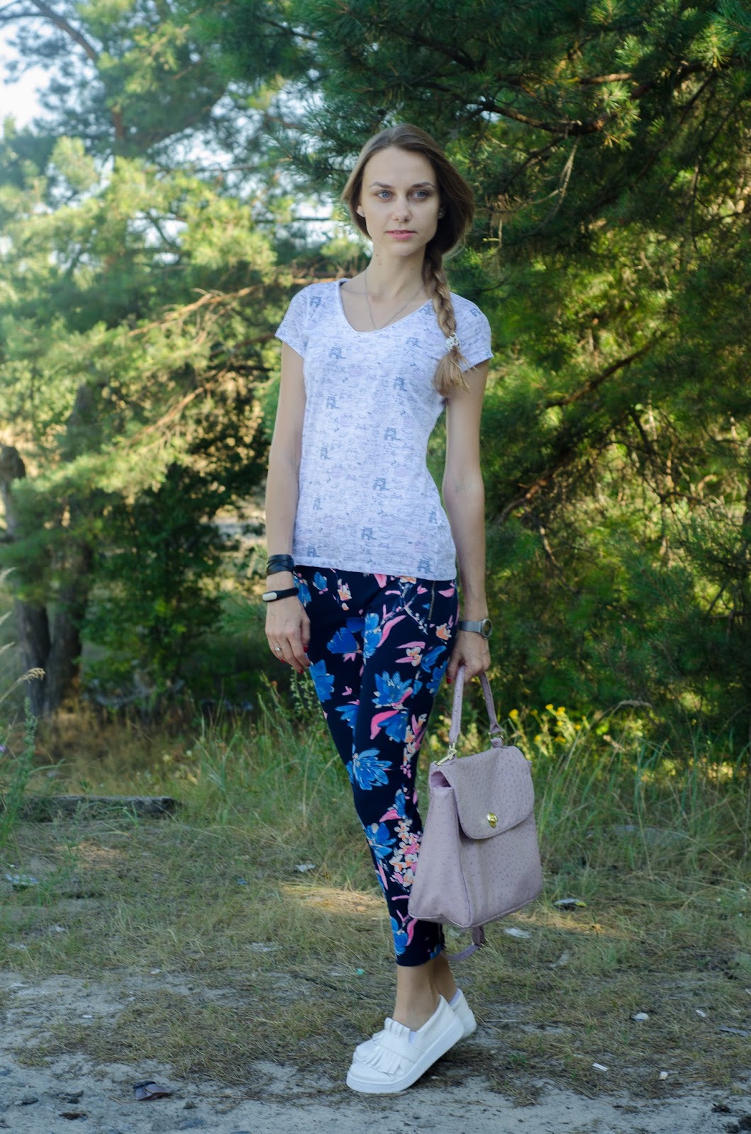 2015-10-01 12:25:00 (читать в оригинале)Pants and a t-shirt is a common combination for many cases. That day, I opted for the cropped floral navy trousers and the white t-shirt with a funny kittens pattern :).