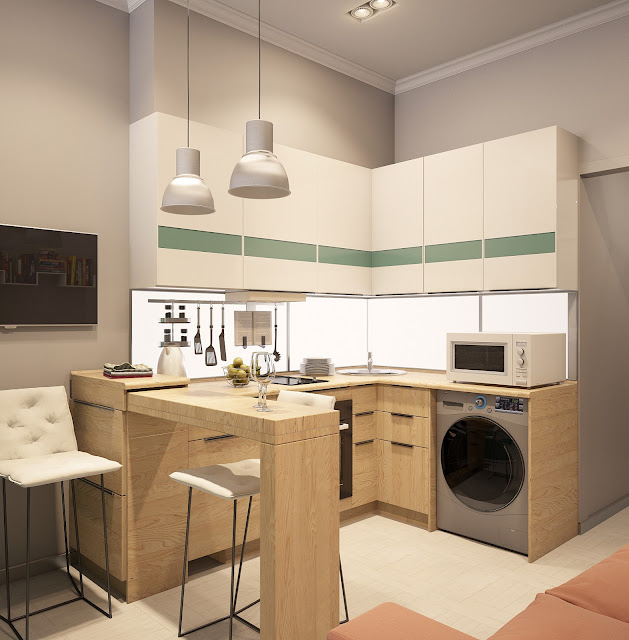 Зона кухни включает в себя небольшую столовую зону в продолжении мобильной столешницы барной стойки и в качестве яркого цветового акцента используется диван терракотового цвета.