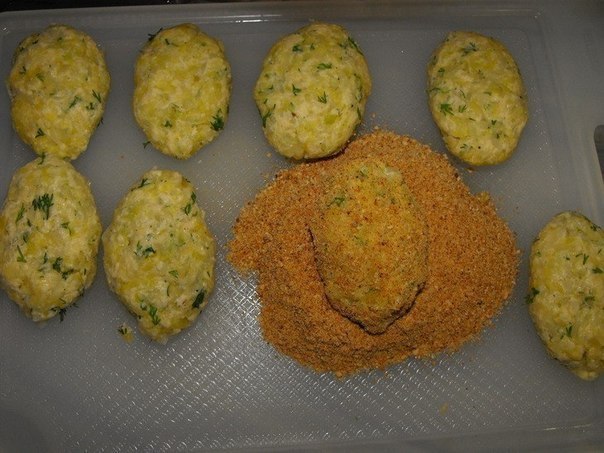 Сформируйте из этой массы котлетки,обваляйте в панировочных сухарях и обжарьте на растительном масле до хрустящей золотистой корочки.