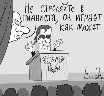 Наверняка кто-то сочтет эту фотографию крайне символичной, потому что в нашей стране грань между политиками и эстрадными юмористами практически полностью стерлась. Монолог студента кулинарного техникума часто неотличим от тех речей, которые мы слышим в новостях, но я бы не стал на этом спекулировать, потому что такая фотография могла появиться и в прошлом году, и в позапрошлом, и при Путине, и при Ельцине, и вообще когда угодно.