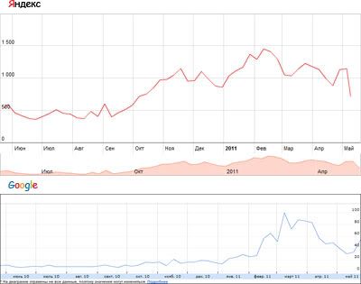 Из любопытства решил глянуть стоит ли возобновить продвижение по данному низкочастотнику и вот какую тенденцию я получил. В Яндексе наметился рост еще с середины сентября 2010 года. Новый скачок пошел в начале 2011, но теперь идет тенденция к затуханию. Гораздо интересней ситуация в Google – до февраля 2011 года все было более-менее статично и не особо привлекательно, а потом скачок и снова угасание. Сейчас снова пошел скачок.