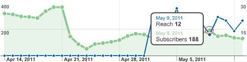 Например, кто не знает Даниила, известного в сети как Маул, автора блога MaulNet.ru? Конечно, есть и такие, что его не знают, но армия читателей блога, составляет уже свыше шести тысяч пользователей, продолжает расти. Как по мне, не важно о чем вы пишите, главное как вы это делаете. Впрочем, что-то утверждать не возьмусь, т.к. мои успехи гораздо скромнее. По данным FeedBurner пик количества подписчиков приходится на 9 мая 2011 года и составляет 188 пользователей, потом пошел резкий спад. На данные до 21 апреля прошу не смотреть, т.к. там я использовал нехитрый трюк с friendfeed.