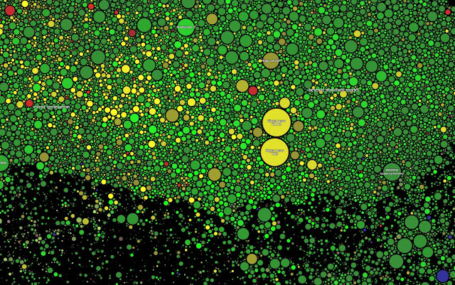 Это всё, больше ничего руками не подстраивается. Дальше просто проводится моделирование силового взаимодействия между миллионом статей и ищется наиболее энергетически выгодная конфигурация, в духе методов молекулярно-динамического моделирования. Все «галактики», скопления, разреженные зоны на карте получаются отсюда сами собой. Особых подробностей этой процедуры не приводится, но похоже, что алгоритм ищет лишь локальный минимум, а для поиска еще более оптимальных конфигураций приходится перестраивать карту руками и перезапускать моделирование. Тем не менее, пусть результат и не абсолютно оптимальный, он все равно получается очень наглядным и релевантным.