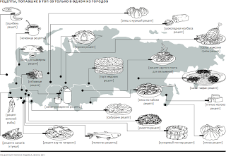 Особенно большую работу Яндекс провел по украинскому сегменту. В частности были проведены исследования предпочтений рецептов по нескольким городам. Правда и по России также приводятся данные по кулинарным рецептам.