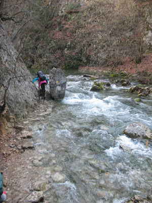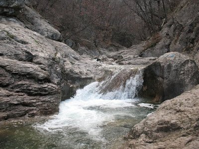 Прогулка набирала обороты, целые поляны подснежников радовали взгляд, тропинка неспешно петляла между буками. Полноводная Аузун-Узень несла свои воды нам навстречу. Скалы слева и справа становились все выше, наглухо заблокировав мобильную связь. В какой-то момент тропинки ненавязчиво уступили место узкой полоске скалы между вертикальными стенами каньона и ледяной водой. Мы уже не шли, а пробирались, перескакивая с камня на камень.