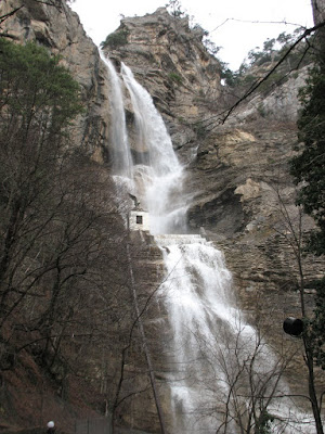 Водный поток, падающий с высоты 98 м, выглядел восхитительно полноводным в это время года. А нас ждал обед ниже по течению и маршрутка на Ялту. Но более соблазнительным показалось спуститься по тропе вдоль реки прямо к Поляне Сказок. Не находились за вчера, ага. Спуск занял минут 15 плюс еще столько же среди будущей элитной крымской недвижимости, прущей из-под земли как грибы на месте недавно сгоревших заповедных лесов. На посещение замечательного Ялтинского зоопарка сил у меня не осталось совсем. Визит туда я отложу до лучших времен. Дальше все просто – маршруткой до автовокзала, пешком до набережной. Что может быть приятней, чем в конце трудного перехода смыть накопившуюся на ботинках и одежде глину в Черном море. На десерт оставалось распить бутылочку десертного коктебельского Кара-Дага с видом на Ялтинский маяк. Приключение, трудное, но незабываемое, подошло к логическому завершению.