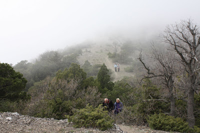После кулича и кагора на привале в живописнейшей долине, мы поднялись еще выше и неожиданно попали в зону облаков, набежавших с моря. Точнее облаками эта субстанция была для тех, кто смотрел на них снизу. Мы же были наравне с ними, шли сквозь них, словно через туман. От этого можжевеловые заросли сразу приобрели вид совершенно сюрреалистичный.
