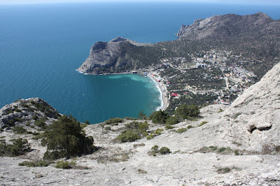 Тропа круто забирала вверх, вилась вдоль гребня. Высота набиралась весьма резво, т.к. идти по голому монолитному камню намного проще, чем по куче мелких – ноги практически не скользят. Сам подъем занял совсем немного времени, да и сил почти не отнял. И вот она, вершина, отмеченная геодезическим знаком. Отсюда не сходя с места можно увидеть и Генуэзскую крепость, и Голубую бухту Нового Света. Надо только немного развернуться.