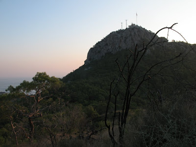 Сама дорога заняла даже меньше времени, чем я рассчитывал. Через 40 минут я был уже у подножия горки. Тропинок вверх не было ни одной, только камни и колючий сухой кустарник среди невысоких сосен. Пейзаж вполне крымский. Карабкаться приходилось очень осторожно, местность явно не хоженая и нетоптаная трава прикрывала опасные щели между валунами. А сами они норовили уйти из-под ног в самый неподходящий момент. В общем, не самый легкий подъем, но и ничего военного. В итоге, через 30 минут я уже был на самой вершине.
