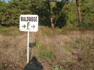 Ни к чему хорошему это ни привело. Я хотел только найти короткую дорогу вниз, к отелю и ожидавшему меня завтраку. А вместо этого дорога вела меня вверх, к следующей вершине, к телевышке. Кстати была она довольно оживленной, несколько раз мне встречались прогуливавшиеся пешком или трусцой люди. В итоге я уточнил дорогу у четы немцев и повернул назад. Не найдя ничего лучшего, я снова нарушил колючий барьер, после чего уже через 20 минут вышел из подгорного леска к поселку. Занимательный знак указывал туда, откуда я вышел. Надпись по-немецки «Лесные тропинки» соответствовала истине, а обнимавшаяся парочка недвусмысленно намекала на повод для прогулки.