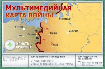 ![]() Проект "ПОБЕДИТЕЛИ. Солдаты великой войны" был создан пять лет назад, к 60-летию Победы. На сайте проекта www.pobediteli.ru размещены списки более 1 миллиона ветеранов Великой Отечественной войны, доживших до этой годовщины. Предусмотрена возможность именного поиска по спискам. На этом же сайте имеется мультмедийная карта всего хода войны с рассказом о ее важнейших событиях и битвах: ![]() |