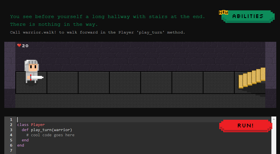 - На ruby - ruby-warrior (это ссылка на ее github).Игрушка для изучения Ruby. Воин должен добраться до вершины башни чтобы достать рубин(ruby) на высшем уровне. На каждом уровне нужно написать скриптик на руби, чтобы воин смог победить врагов, освободить пленников и добраться до лестницы.