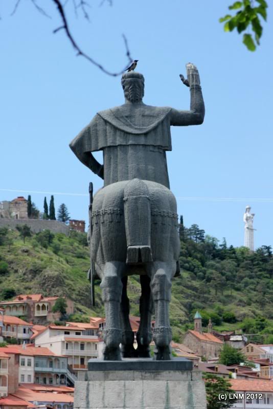 Вахтанг с птичкой приветствуют Родину-мать на холме Мтацминда