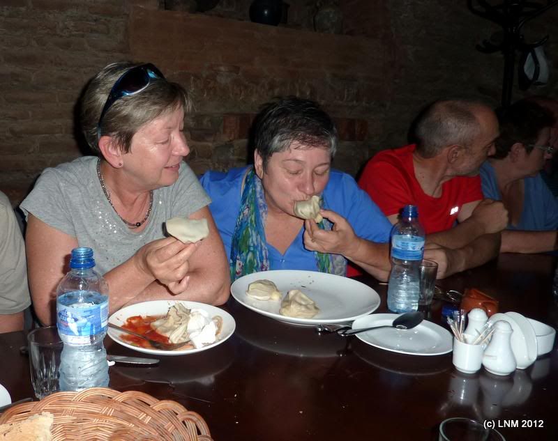 За обедом нас усадили за длинный-предлинный стол и для начала накормили свежими овощами и божественным харчо. Потом принесли грузинский кебаб – тут он имеет форму большой сигары: мясо завернуто в тонкое тесто. Вкусный. Потом хинкали – божественные. Сонька демонстрировала мастер-класс по поеданию хинкалей