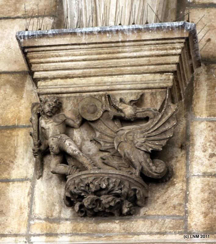 Вообще скульптур прекрасных на зданиях - только ходи и снимай, и такие все славные. Вот очередной герой со змием - но Георгий ли? Вместо копья булава, и лошадь отсутствует
