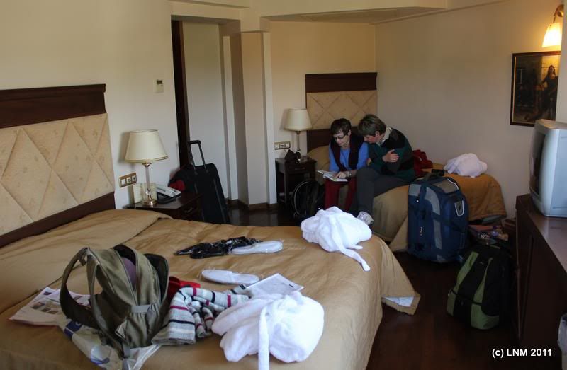 Приезжаем в отель – шикарное модерновое лобби (со вкусом сделанное), лифт, чистые красивые современные комнатки – но тесные... не знаю, может мы заказали самые дешевые, а есть еще какие-то попросторнее? и кроме того, нет ковра для Алкиной зарядки и нет стаканов – вообще ни одного! Это ведь ладно, что нет чайника, даром что ли мы свой таскаем, но стаканы – это все-таки нехорошо. И вообще спрашивается в задачнике: разве чайник – не маст для трех звездочек?