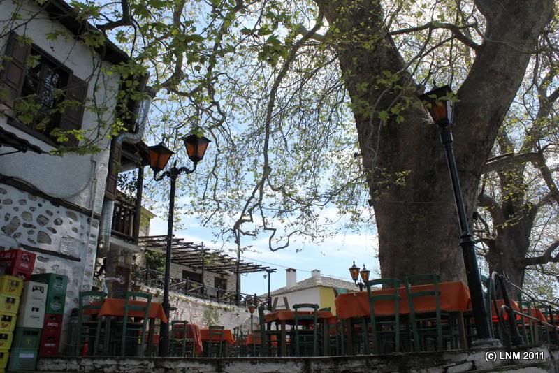 Выехали в 9, в Волосе были уже в 11. Первыми местами, упомянутыми хотя бы в одном из наших трех источников, были Кала Нера, Милиес и Высица. Направили Сережу на Милиес, Высицу он не знал. На Кала Нера (по дороге) вылезли подышать морским воздухом, больше там делать было нечего. А в Высице погуляли – очень красиво. Главная площадь – знакомое дело: платан-великан
