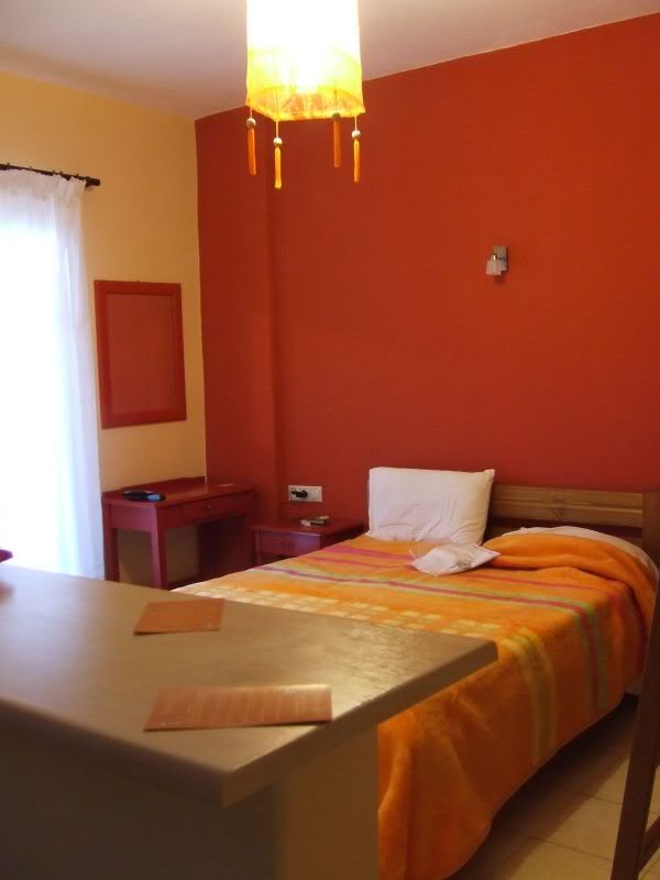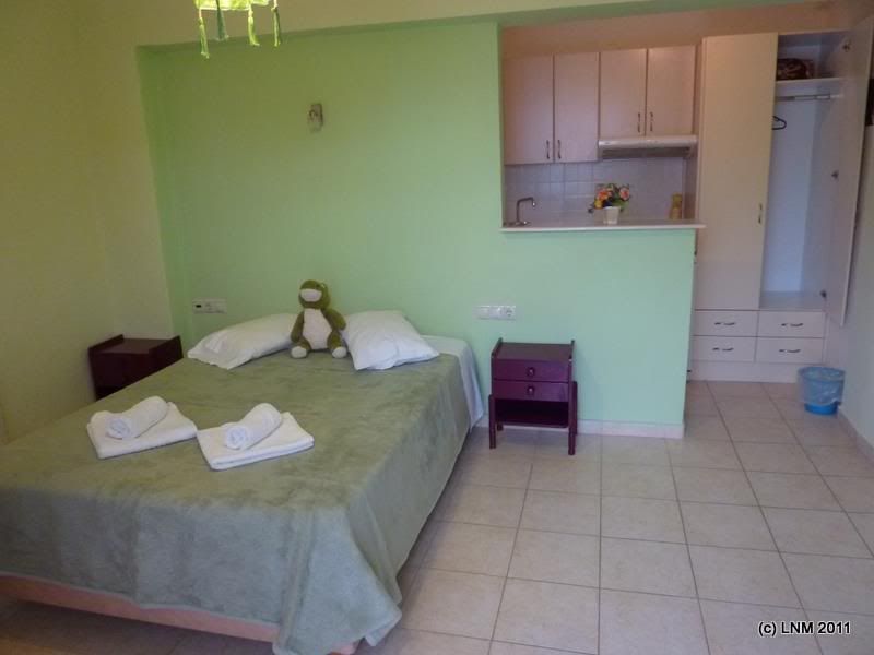 Когда ломились в очередной отель, мимо проходила тетенька и спросила, не может ли она нам помочь. Вот, говорим, отель ищем. И тогда эта тетенька кликнула другую тетеньку в окно дома через дорогу. Та помахала ручкой с балкона и спустилась к нам со связкой ключей. И повела нас в эээ... апартаменты, которые назывались «Белла-студио». Эти самые апартаменты и были, собственно говоря, открыты у меня в компе на букинге. Но открыты на самый крайний случай, потому что фото комнаток с детскими столиками и стульчиками, выкрашенных в психоделически-радостные цвета, как-то не очень манили к проживанию.