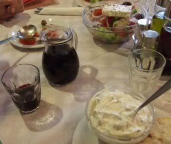 Вообще-то вместо этого всего мы хотели заказать два местных керкирских блюда, которые значились в меню - но нам объяснили, что сегодня у греков особый день (что-то связанное с Пасхой) и нельзя есть мясо. Правда, которое на гриле почему-то можно - ну мы его и взяли. Так что вкусно было все равно - особенно с домашним вином.