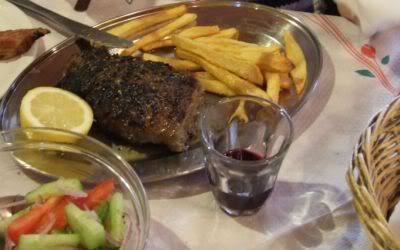 Взяли греческий салат, дзадзики, жареную фету, бараньи ребра и "бифтеки", которые по-гречески пишутся как-то вроде "мпифтеки":