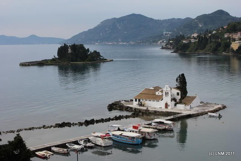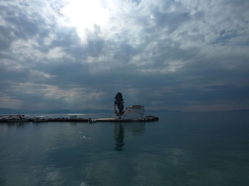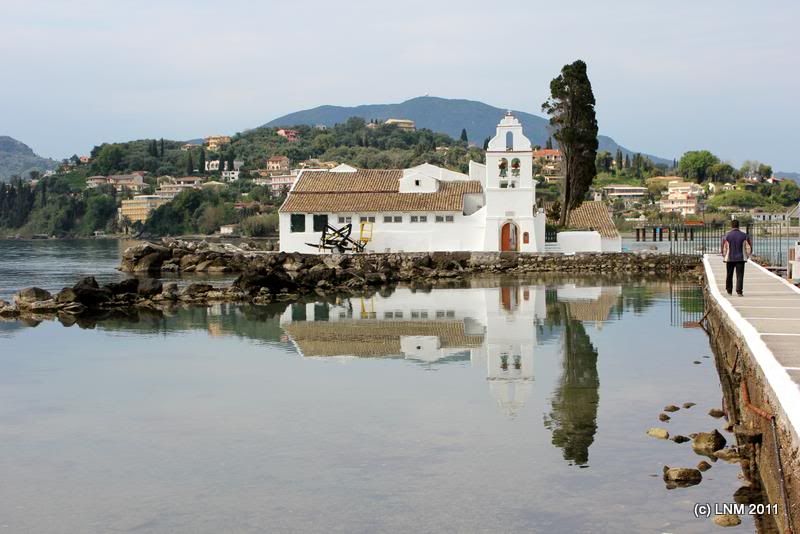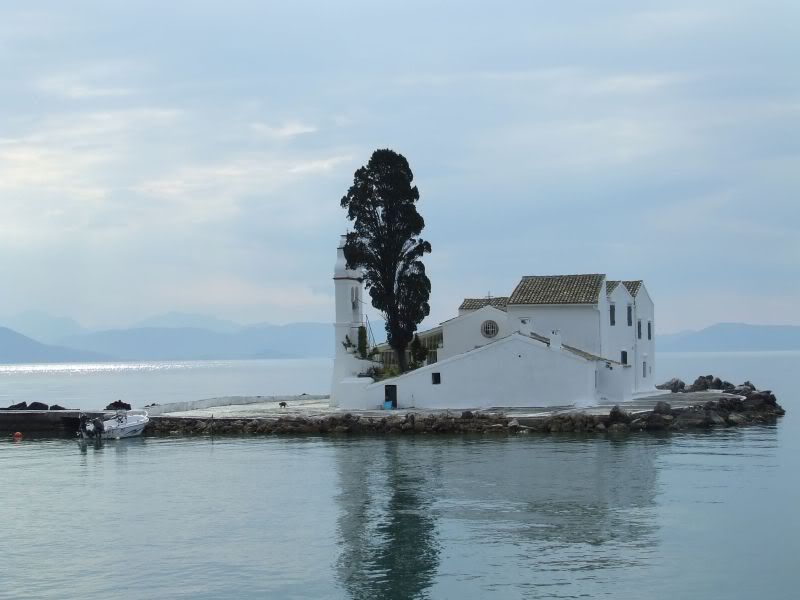 Тот островок, до которого пешком не доберешься, а только на лодке от Влахерны - это и есть Мышиный остров (Понтиконисси). Если верить «Одиссее», то это корабль Одиссея, превращенный Посейдоном в скалу. Там своя церковь, XII века, полуразрушенная.