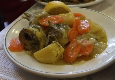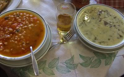 В общем, нормальную еду мы нашли километра за два от парковки, возле самой цитадели. Еда роскошная! И хозяин тоже. Взяли фасолевый суп, и пирог со шпинатом, и артишоки, и еще пасхальный суп под названием майерица (magiritsa). На фото она серенькая, справа. Основные ингредиенты - баранина и баранья печень, все остальное может меняться, как и в любом национальном блюде. Вкусно!