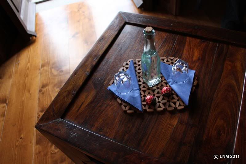 На столике по маленькой конфетке на каждого и маленькая бутылочка местного напитка под названием ципуро. Это что-то вроде бренди, изготавливаемого из виноградных выжимок. Вычитала в тырнете, что ципуро - это то же, что и узо, но узо производится по стандартному рецепту и в промышленных масштабах, а ципуро - домашний вариант, у каждого региона и семьи - свой рецепт.