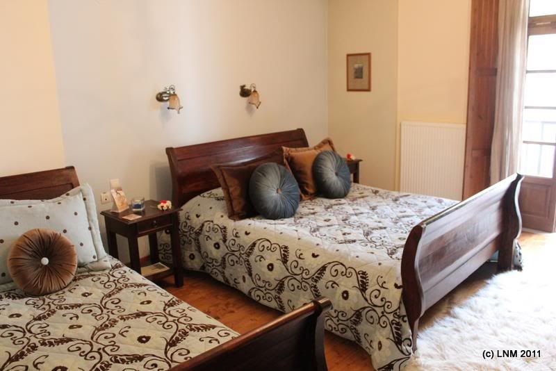 Навстречу выскакивает девушка-филиппиночка, мол милости просим в салон. В салоне сидят хозяева: кириа София и кириэ Лаки. Лаки - уменьшительное от какого-то зубодробительного полного имени: кажется, Кристодулос. Хозяева по-английски не шпрехают, держат на то филиппиночку, звать Мариса. Вы, говорят все вместе, присаживайтесь, кофе будем пить. Левка выразительно стучит по часам, пытается донести до народа слова daylight и walk, на него ноль внимания. Куда мол спешить? И то правда. Принесли нам кофе с пряником каким-то пасхальным - самодельным, как обещано. Сюрприз! наконец-то правильный, вкуснейший греческий кофе. А теперь – покажите нам нашу комнату. Не так-то просто. Мариса проводит нас по всем восьми комнатам, одна краше другой, каждая посвящена какому-то цветочку, на каждой мы восклицаем о! нам, пожалуйста, вот эту - но нам, оказывается, приготовили последнюю, и она тоже не хуже других, да еще и подогрета к нашему приезду.