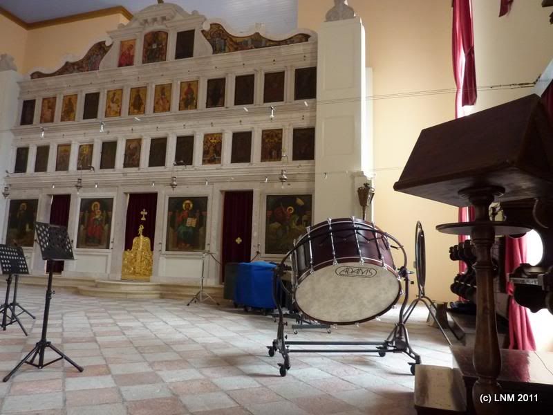 А в античном храме – православная церковь, а в церкви - почему-то большой барабан... Сюр...