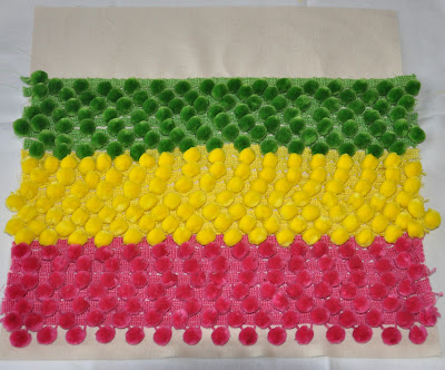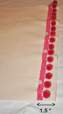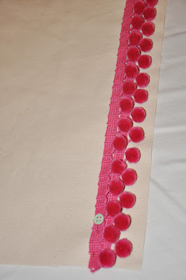 Materials: 14" pillow form 1/2 yard white duck or twill fabric. 12 yards of pompom trim