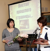 Председатель комитета по делам культуры Т.Н.Киселёва вручила Грамоту Главы района библиотекарю Сосновицкого филиала Коноваловой Л.И. в связи с её 60-летием и 30-летием работы в библиотеке.
