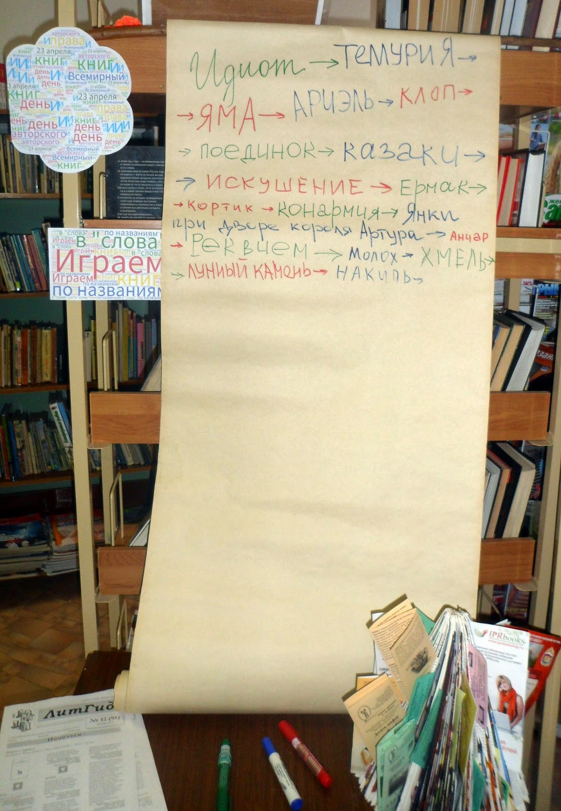 2015-04-23 16:56:00 (читать в оригинале)Сегодня, 23 апреля, на планете отмечают Всемирный день книг и авторского права. В этот день на абонементе Центральной библиотеке читателям предложили сыграть в слава из названий книг. Надо вспомнить и написать на свитке название книги, которое начинается на ту букву, которой оканчивается название предыдущей. Если никак не вспомнить нужное название, то можно побродить по фонду и найти нужную книгу с нужной буквой. Оказалось не так и просто назвать книгу на букву «Я», «Х» и долго думали над «М». Но все же, наши читатели показали хорошее знание русской классической литературы, особенно книг А.И. Куприна.
