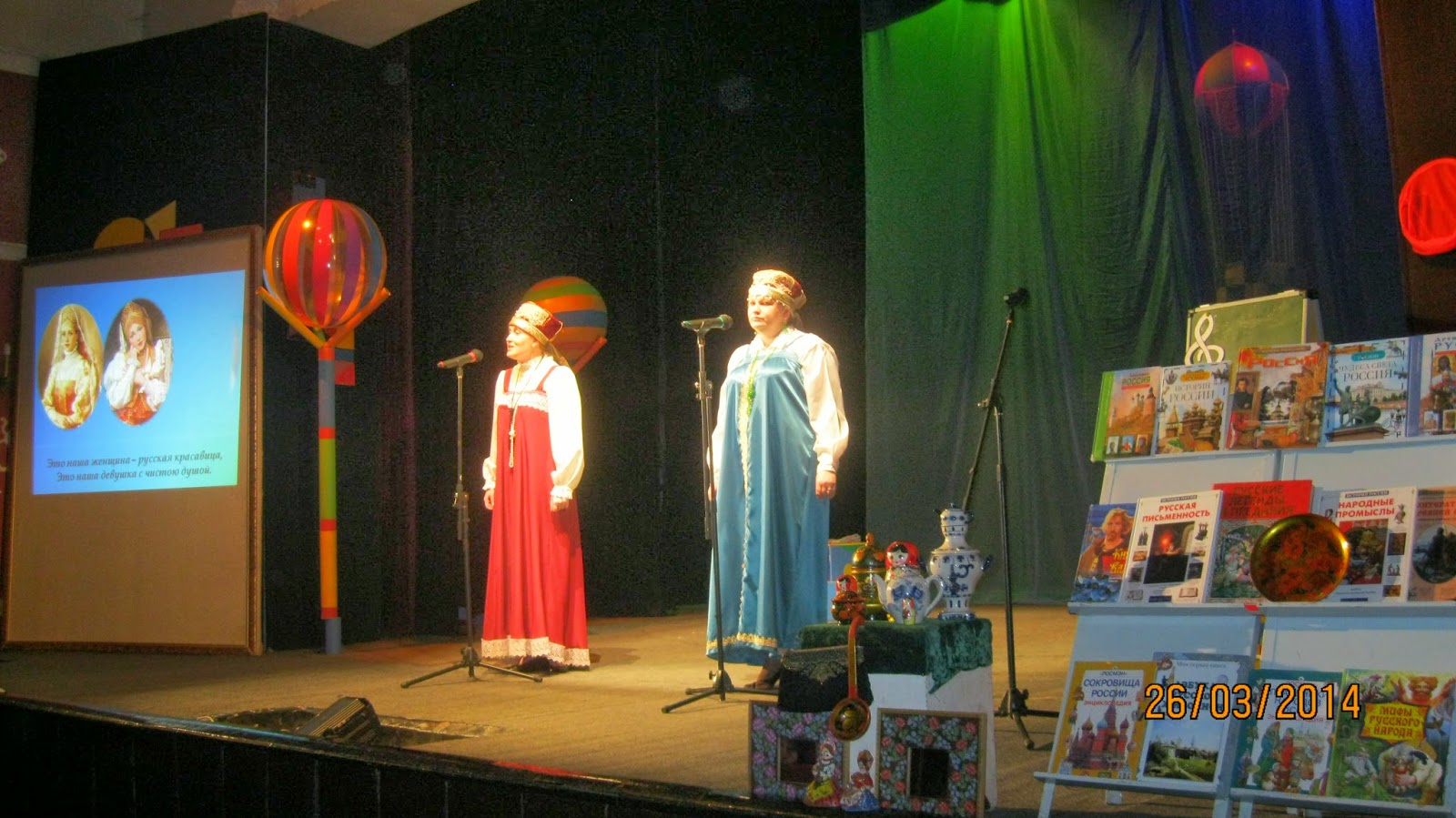 Две сестрицы-сказительницы Ярослава и Славяна (сотрудники детской библиотеки) познакомили зрителей с историей зарождения русской культуры. «Драгоценные россыпи русской культуры» - именно так назывался праздник «Недели детской книги». Ребята из зала отгадывали загадки, участвовали в конкурсах, узнали много нового и интересного о русской культуре, о народных промыслах. На сцене оформлена книжно-предметная выставка «Народные промыслы».