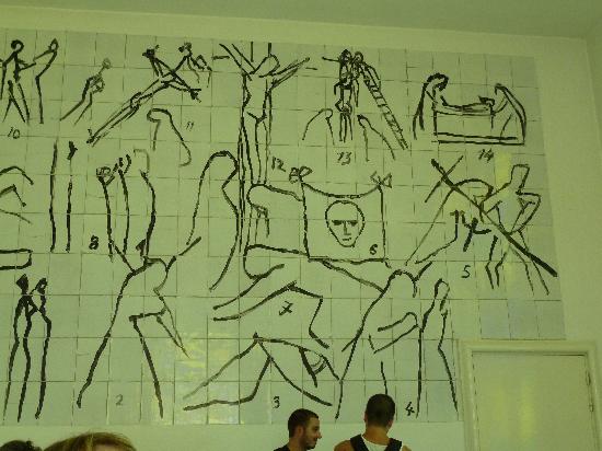 Ну и наконец, большие композиции на стенах. Цвет отсутствует. Черная линия на белой керамической поверхности. Черный и белый - цвета Доминиканского ордена. Аскетичная отрывистая линия производит впечатление предельной открытости, практически обнаженности.