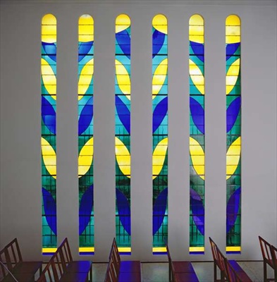 Потрясающее освещение создается тремя цветами - чистейшим синим, ослепительно желтым и ярко-зеленым - витражей, простой и строгий рисунок которых дает ощущение духовной полноты.