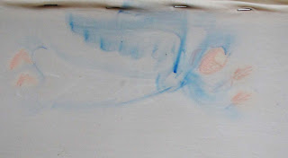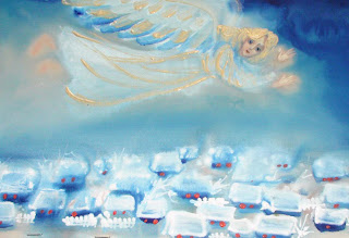 Сегодня мы будем заниматься свободной росписью. Для такой работы нужны или загрунтованная ткань ( лёгкий раствор клея ПВА, раствор соли) или густые акриловые краски для ткани. Я выбрала густые краски. Если таких красок у вас нет, можно сварить загустку из картофельного крахмала или добавить в жидкую краску обойный клей на основе модифицированного кукурузного крахмала. Для работы приготовьте небольшие объёмы краски с крахмалом. Вы должны использовать всё. Краситель добавляют в остывший крахмальный клейстер. После закрепления краски- крахмал легко вымывается тёплой мыльной водой. А можно оставить и с крахмалом. Я натянула лоскут шёлка. - это рукавчик от блузы. Смочила его пульверизатором и акварельным карандашом наметила фигуру ангела парящего ангела. Лишняя влага искажает линии рисунка, поэтому если ткань получилась слишком мокрая - подсушите её слегка феном. На фото виден результат после 2-минутной паузы после проведения линий карандашом. Вы видите, что карандашная линия слегка "поплыла". Этот не страшно. Свободная роспись - это почти акварель. А акварельный карандаш легко перекрывается акриловой краской. Зато, мы знаем какая примерно будет фигура, какого размера, куда повернута, положение рук, форма крыльев.   Теперь я начинаю красить небо синей, разведённой слегка краской и тут же подсушиваю растекающееся пятно, чтобы оно не залезло на светлые участки рисунка - лицо и руки. Я просто не подпускаю близко краску. Белый ореол вокруг намеченного рисунка - это свечение ангела, так я представляю, что он испускает свет. Поэтому не надо близко подходить к фигуре нашего персонажа. Теперь вы видите мою задумку в полном размере. Ночной ангел летит над зимними домиками. И рассыпает Благодать. Домики пока намечены грубыми мазками синей краски. Потом мы "надеваем" на домики крыши. Это белая краска. Так как я рисую всё время по мокрому, она соединяется с предыдущим слоем синей. Через пару минут начнётся диффузия красок и мазки не будут такими грубыми. Мне хочется подчеркнуть белым крыши. Это я делаю, заправленной в бутылочку с узким носиком, той же белой акриловой краской. Она вытекает толстыми линиями. Теперь надо взять кисточку и растушевать немножко капли краски, чтобы они не " стояли" плотными островками на тонкой ткани. А задний план вообще растушевать сплошной линией. Там туман, снег. Всегда на заднем плане видно не так не так четко, как на переднем. Так создаётся глубина рисунка Теперь давайте вернёмся к нашему ангелу. Пора ему прорисовать крылышки. Возьмите на кисточку синей краски с каплей белой, но не перемешивайте их. Нанесите снизу вверх пёрышки. Это будет самый крайний ряд перьев. Чуть повыше сделайте такой же ряд более светлым цветом. Сделайте ещё несколько рядочков, сколько позволит ширина крыла.