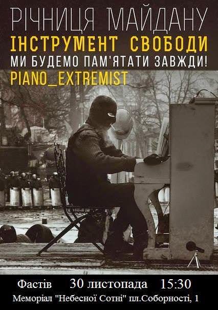 Наступної неділі, 30 листопада Фастів з виступом планує відвідати відомий піаніст в балаклаві з Майдану, який має нік "Piano_Extremist". Виступ відбудеться на Соборній площі Фастова, біля меморіалу "Небесної Сотні" (колишнього пам'ятника Леніну) о 15.30.