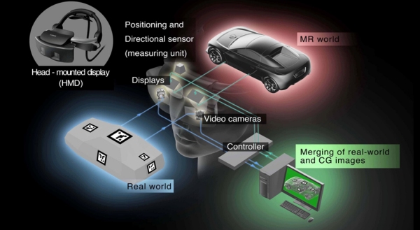 Компания Canon сообщает о скором выводе на рынок систему дополненной реальности, называемую ими Смешанной Реальностью (Mixed Reality). Представленная система должна объединить реальный и виртуальный миры и способствовать сокращению времени, необходимого на разработку продукта. Как нетрудно догадаться что система состоит из двух камер, для регистрации внешней обстановки в 3D режиме и передачи данных в компьютер, и двух небольших мониторов. Также система дополнена призмами особой формы, наличие которых способствует совмещению реального изображения снаружи, и виртуального, выводимого на дисплеи. Благодаря трехсторонней конфигурации системы удается добиться качественных изображений с низким уровнем искажений в периферийных областях, вызванных оптическими аберрациями Конструкцию можно видеть на рисунке: Единственный минус подобной технологии заключается в том, что она работает при использовании нанесенных на объекты реального мира специальных маркеров, обрабатываемых на ПО системы, благодаря которым система может в реальном времени отрабатывать движения пользователя. Компания сообщает, что их система дает возможность просмотра полномасштабного трехмерного компьютерного изображения. На этапе проектирования, система может может помочь уменьшить количество требуемых прототипов, и, в дополнении к сокращению времени, затрачиваемого на разработку, может способствовать сведению к минимуму затрат и воздействия на окружающую среду (как это мило с их стороны, не правда ли...). Предполагается использовать эту систему при моделировании производственной обстановки, это позволит пользователям пройти через завод и увидеть макеты оборудования из первых рук. Система также поддерживает сбытовую деятельность путем имитации продуктов для клиентов, позволяя им управлять и просматривать продукцию под разными углами. Другие возможные области применения могут включать оценку внутренней планировки при ремонте дома. Canon планирует расширить приложения для новой системы в различных областях, таких как проведение хирургических операций, индустрия развлечений и т.д.Цены будут варьироваться в зависимости от конфигурации системы в соответствии с требованиями использования. Новая система будет доступна в конце июля этого года.