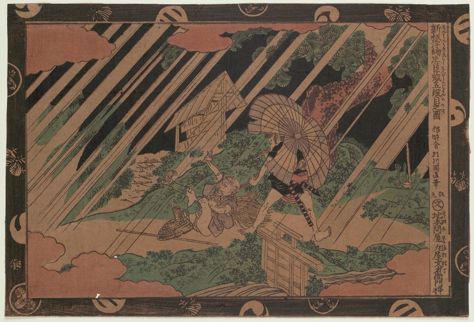 Одной из таких работ, прославившая художника, стала серия рисунков к подражательскому роману на произведение классической литературы под названием "Лже-Мурасаки, деревенский Гэндзи" ("Нисэ Мурасаки инака гэндзи").
