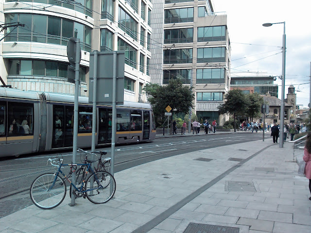Такие вот трамваи тут ездят! Кстати, что очень бросается в глаза - шума от поездов и трамваев практически нет как снаружи от них, так и в салоне! Даже дизельные их поезда и автобусы - ездят практически бесшумно в сравнении с нашими! И еще одна заметка - у нас когда дизельный поезд или автобус трогается - сзади всем уже привычное облако непроглядного дыма образовывается. А здесь - его нет вообще!!! Ну вот спрашивается - сколько мы, бараны, будем еще сами себя травить, а ?! Это здесь всюду будут фото с центральной речкой Дублина - River Liffey (речка Лиффи). И опять же нам в укор - здесь через каждые 200-500 метров - мостик через любой водоем, если не автомобильный, то пешеходный. Понимаете о чем я, собратья-Киевляне? :) Здания Международного Финансового Центра в Дублитне, Ирландия. Это называется - "самое высокое здание в Ирландии"! :) Центральное управление местной полиции - Garda. Это - живая реклама паба :) Как бы там ни было - все, включая приезжих, обратили на эту рекламу внимание! Обратите внимание на обустройство велосипедной дорожки! Мне, как любителю велосипеда, этот момент сразу бросился в глаза... опять же в сравнении с отсутствием таковой на родине :(