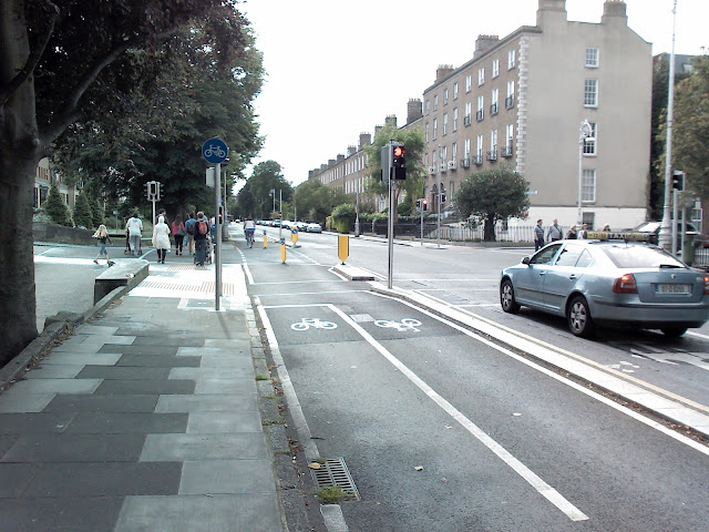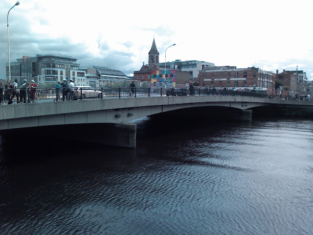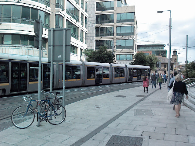 Такие вот трамваи тут ездят! Кстати, что очень бросается в глаза - шума от поездов и трамваев практически нет как снаружи от них, так и в салоне! Даже дизельные их поезда и автобусы - ездят практически бесшумно в сравнении с нашими! И еще одна заметка - у нас когда дизельный поезд или автобус трогается - сзади всем уже привычное облако непроглядного дыма образовывается. А здесь - его нет вообще!!! Ну вот спрашивается - сколько мы, бараны, будем еще сами себя травить, а ?! Это здесь всюду будут фото с центральной речкой Дублина - River Liffey (речка Лиффи). И опять же нам в укор - здесь через каждые 200-500 метров - мостик через любой водоем, если не автомобильный, то пешеходный. Понимаете о чем я, собратья-Киевляне? :) Здания Международного Финансового Центра в Дублитне, Ирландия. Это называется - "самое высокое здание в Ирландии"! :) Центральное управление местной полиции - Garda. Это - живая реклама паба :) Как бы там ни было - все, включая приезжих, обратили на эту рекламу внимание! Обратите внимание на обустройство велосипедной дорожки! Мне, как любителю велосипеда, этот момент сразу бросился в глаза... опять же в сравнении с отсутствием таковой на родине :(
