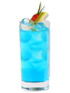 В шейкер добавить лед и налить ликер блю кюрасао и водку. Перемешать. В большой коктейльный бокал положить три-четыре кусочка льда и перелить напиток из шейкера. Долить сладким лимонадом, например СПРАЙТ или 7UP. Украсить долькой лимона и красной коктейльной вишней.