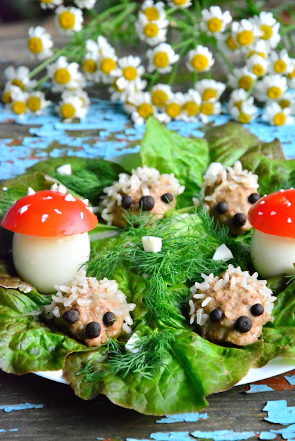 Хочу предложить вам простой рецепт с детским оформлением. Такая подача непременно понравится вашему ребенку..  Сформовать небольшие котлетки, придать форму ежикаОформить глаза и нос ежика черным перцем горошком, колючки рисом. Готовить на пару до готовности. Я воспользовалась мультискороваркой. Тарелку оформить зеленью. Выложить ежиков. Грибы сделать из яиц, шляпки из помидоров Приятного аппетита!