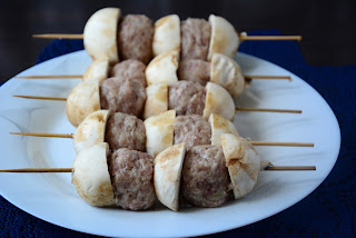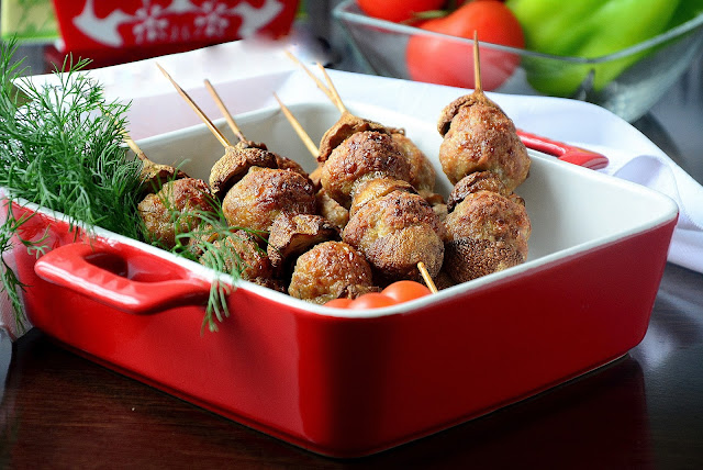 Если нет возможности сделать шашлык на природе, можно попробовать сделать его в домашних условиях. Получится ничуть не хуже! Попробуйте!  Два ломтика батона замочить на пять минут в водеВ мясной фарш вбить яйцо, добавить соль и паприкуВ блендере пробить лук и размякший батон (удалив лишнюю воду). Выложить все в фарш и хорошо перемешать. Получившийся фарш хорошо `отбить`, Затем из него налепить мясные шарики На деревянную шпажку нанизать поочередно грибы и мясные шарикиЗапекать в хорошо разогретой духовке при t-180* на режиме Гриль 30 минут. Подавать со свежим овощным салатом. Приятного аппетита!