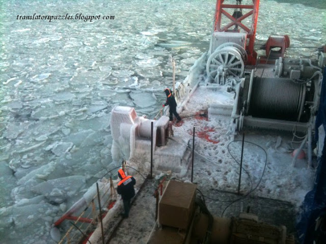 Самый прикол, что Байдарацкая губа свободна ото льда в среднем 70 дней в году - это тот коротенький период, когда можно проводить работы. Ну и погода всегда держит в тонусе - морозный ветерок, солнышко (...и день чудесный, все как у классика). В ноябре при минус восемь уже хочется одеть на себя любые доступные телогрейки и ватники, а поверх укутаться одеялами - ну ооочень холодно! Лед возникает странно и мгновенно - сначала на воде появляется "сало", напоминающее, уж простите, сопливую субстанцию, плавающую на поверхности воды, а потом рраз! - и глыбы льда, и надо срочно валить!!  | | То самое сало |