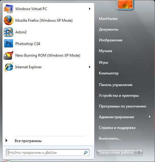 (рис.№10) Это меню называется главным меню. Оно разделено на две части: 1. Левая часть перечисляет программы которыми вы наиболее часто пользуетесь. Внизу левой части вы найдете вкладку "все программы", в которой соответственно находятся все программы которые установлены на вашем компьютере. Чуть ниже вы увидите "строку поиска" с помощью неё можно найти любой файл или приложение всего лишь вписав его название в строку и нажав на значок справа.2. В правой части как вы видите на (рис.№10) можно увидеть такие вкладки как документы, изображения, музыка, игры, компьютер и т.д. но о них я напишу в следующих статьях.
